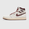 Le Air Jordan 1 A Ma Maniére presentano una tomaia in pregiata pelle screpolata con colletto e Swoosh in pelle effetto rettile bordeaux. La fodera trapuntata in seta e le etichette personalizzate in tessuto su linguetta e soletta aggiungono un tocco di lusso. Alla base, una suola ingiallita conferisce un tocco vintage che completa il design.