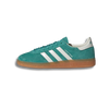 Caratterizzate da una colorazione verde pastello con dettagli bianchi, le scarpe da indoor adidas Handball Spezial Sporty & Rich Green presentano una tomaia in morbida pelle scamosciata. Le 3 strisce e il tallone sono in morbida pelle bianca, mentre la suola in gomma è spessa. La scritta "SPORTY & RICH" lungo il logo a 3 strisce è stampata con lamina dorata che risalta sulla base verde. Altri dettagli del brand includono l'etichetta rettangolare con il logo Sporty & Rich cucita sulla linguetta piatta in pelle scamosciata.